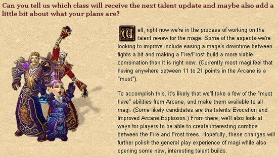 答:好的,目前我们正在进行对法师天赋的重新修改。目前我们的一些主要想法是,缩短法师在战斗后的恢复时间,以及使得在 冰系/火系 天赋上投入点数比起现在的状况要显得更加有效。(目前许多法师们认为在“奥术”天赋树上投入11-21点还是必需的。)