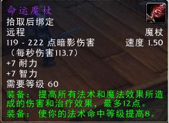 前者为65级任务奖励,DPS(每秒伤害)103。9,+9耐力,+9智力,+7法术命中,+11法术伤害;后者需求等级60,DPS113。7,+7耐力,+7智力,+8法术命中,+12法术伤害。后者是艾泽拉斯世界中几乎最好的魔杖,却只能算略微优于前者(少4属性数值,多1点法术命中等级及法伤,DPS并不是魔杖的第一属性,魔杖的好坏主要看属性点及法术加成等)。可见随等级的提升,低端玩家的装备水平必将追上高端玩家。