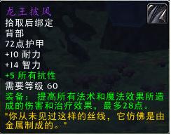 前者亦为65级任务奖励,66点护甲,+15耐力,+14智力,+9精神,+13法术爆击等级,+16法术伤害;后者为BWL最终BOSS奈法利安掉落,72点护甲,+10耐力,+14智力,+28点法术伤害。综合属性二者大致相当,但龙王披风毕竟为NEF掉落,物品等级较高,法伤属性也略微高一些。但作为一件65级的野外蓝色任务奖励,其综合属性与NEF掉落级物品大致相当,在获取难度上已有相当大的差距,看来外域的天平还是向低端玩家偏斜了一些。