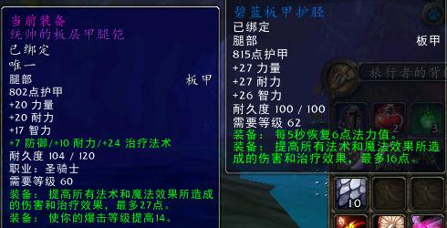 前者需求等级62,奴隶围栏BOSS掉落,815点护甲,+27力量,+27耐力,+26智力,+6点每5秒回魔,+16点法术伤害;后者802点护甲,+20力量,+20耐力,+17智力,+14爆击等级,+27点法术伤害。前者比后者多出23点属性值,6点回魔量,少14爆击等级,11点法术伤害,整体属性优于后者,若不是考虑套装属性,我早已换上前者。62级的蓝色装备就已经如此优秀,看来外域装备的更换速度在副本中远高于野外,所以高端玩家在副本的既定优势也加快了他们更换装备的速度,这一点完全优于低端玩家,不前提自然是要多多副本。