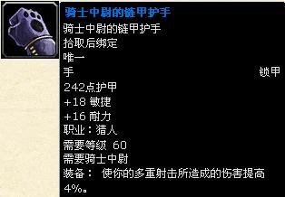前者需求等级58,276点护甲,+15敏捷,+22耐力,+30攻击强度;后者需求等级60,242点护甲,+18敏捷,+16耐力,多重射击伤害+4%。风暴前夕中PVP荣誉装备的护甲值已经在原基础上得到提升(绿色数字显示),但这件60级蓝装的护甲值却仍不如一件外域掉落的58级绿装;而30点攻强的综合作用绝对强于3点敏捷及4%多重射击伤害的加成,更何况还有额外的6点耐力值加成!注意,这只是58级的世界掉落绿装散件!属性居然强于T1级别装备!