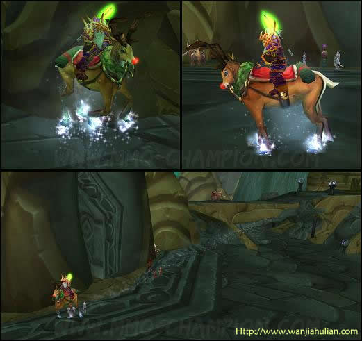玩家可以通过完成特殊的节日任务得到此物品,现在它可以用在飞行坐骑上了!它可以暂时地将玩家的飞行坐骑转变为一头能飞的驯鹿!在飞行轨迹上撒下点点的光辉^^