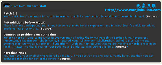 “我们已经得到了大量关于2.4版本的信息;但是一点2.5版本的消息都没有,我想知道2.4.0版本是否会在二月或者三月放出,而WotLK就会在夏天的某个时间放出呢?”
