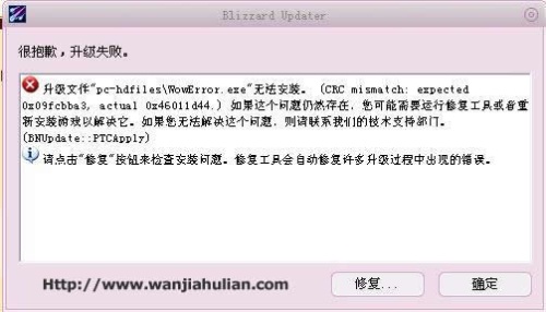 升级文件"pc-hdfiles\WowError.exe"无法安装。 (CRC mismatch: expected 0x09fcbba3, actual 0x69d9f1f4.) 如果这个问题仍然存在,您可能需要运行修复工具或者重新安装游戏以解决它。如果您无法解决这个问题,则请联系我们的技术支持部门。 (BNUpdate::PTCApply