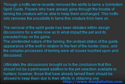 之前BLZ发现了这个小小的问题,不过他们决定让此事放任自流。猜猜看?他们改主意了,“尘泥沼泽的恐怖图腾灵魂导师可以被驯化”正式成为了一个bug,已经被修复了!然而,如果你已经抢先得到了这只幽灵狼宠物,BLZ没有收回它的意思。