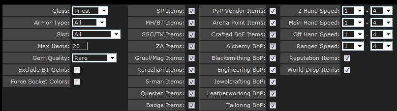 第三列: PvP,竞技场,商业制作的BoE装备,炼金BoP,锻造BoP,工程BoP,宝石BoP,制皮BoP,裁缝BoP;