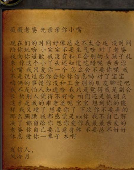 事情要从今天下午说起。今天是7月11号,下午我照常打开电脑上WOW。上去后发现一个人在铁用交易频道喊话刷屏。本来想直接屏蔽掉,但是我突然发现这个人的名字我很熟悉,刷屏内容让我半天回不过神,具体内容是:“梦世繁华工会牧师xxx(真实姓名这里忽略,尊重个人隐私)安徽凤阳人,北京农业大学大四学生,游戏里骗我感情,骗我身体,现在一切矢口否认,你不是说过爱我一辈子吗?”我很差异啊,这个人正是我老婆的妹妹(有血缘关系的那种)。我问她你这是怎么了,发生什么事情了。快告诉姐夫,她跟我说:“风冷月(男一号:梦世繁华工会的副会长,职业牧师)他骗我!他说他一辈子都爱我,在游戏里追我的时候,带我升级,对我很细心,那时候口口声声叫我老婆,但是突然一天,一切都变了,他在工会里找到了新欢。到现在短信不回电话不接,而且不承认这件事。我要让他给我一个说法!让大家都知道他是个什么样的人。”