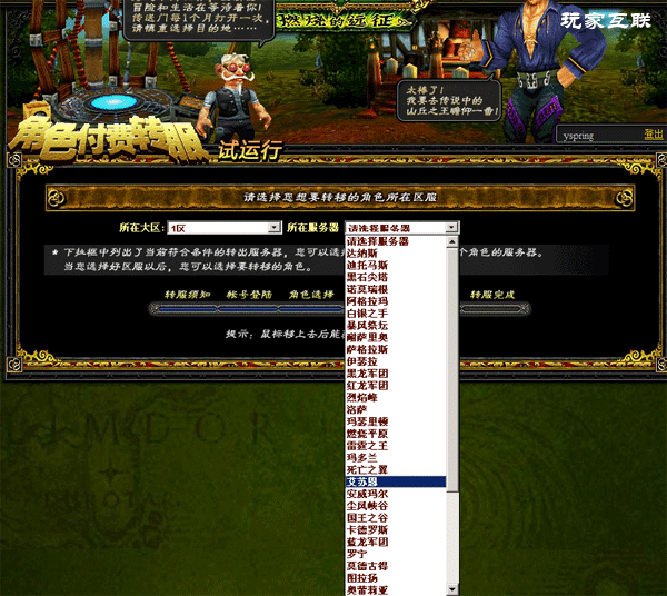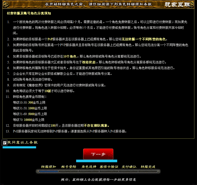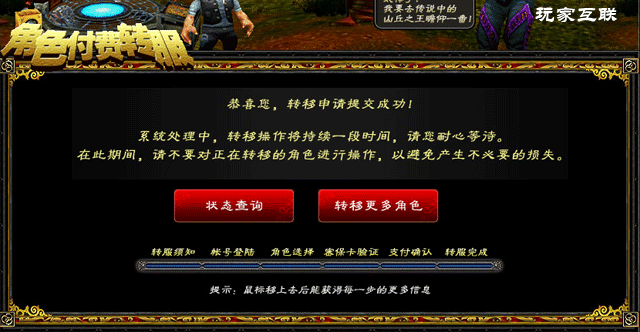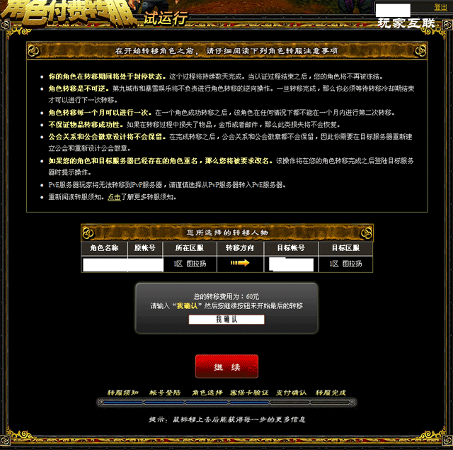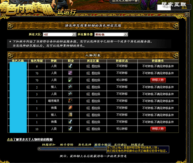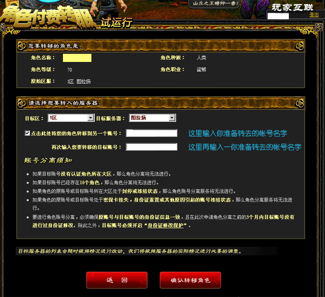选择A帐号所在大区和服务器名,然后系统列出此帐号内所有角色,符合分离角色条件的角色表格最后一栏很醒目的红色标志。