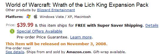 虽然暴雪没有在官方网站宣布《魔兽世界》的第二个资料篇“巫妖王之怒”的发布日期,但是在亚马逊书店(国外最著名的电子商务网站)英国站的首页头条上,出现了《魔兽世界:巫妖王之怒》(World of Warcraft: The Wrath of the Lich King Expansion Pack)的发售信息.《魔兽世界-巫妖王之怒》将于11月3日在亚马逊开卖,售价39.99美元.