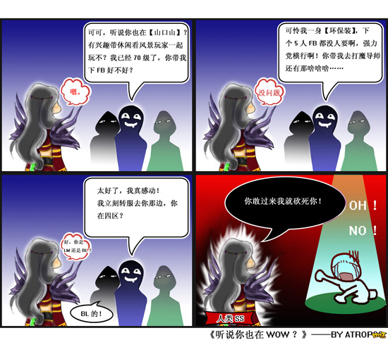 在QQ群里聊天的时候,发现群里不少朋友都在玩WOW,但是大家彼此却不知道,由于更新3.0,大家一边下载一边交流,结果发现都在玩WOW,于是,出现了混乱的“认亲”场面…… 大家阵营不同,经常成为无法一起玩的因素 = =5555,所以画了这个四格。