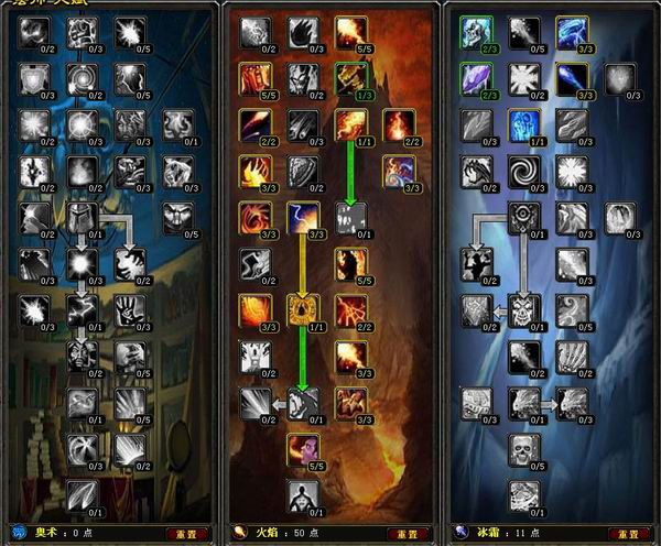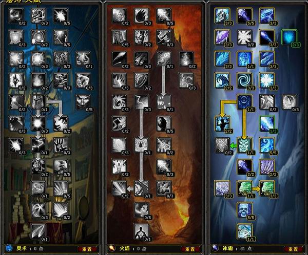 尽管普遍认为3.0奥法要比冰法强不少,但是依然有不少死忠坚持冰法PvP.冰系44点比较常规(PS:如果[极寒冰霜]不点的话,可以挪一点来强化暴风雪,可以增加不少AE伤害).奥系方面,我这里是选择了[强化奥术飞弹],如果给反到冰系我觉得还是想指望一下它,毕竟[奥术专注]也比较不适合PvP. | | |