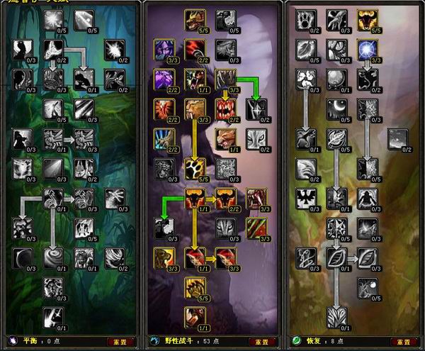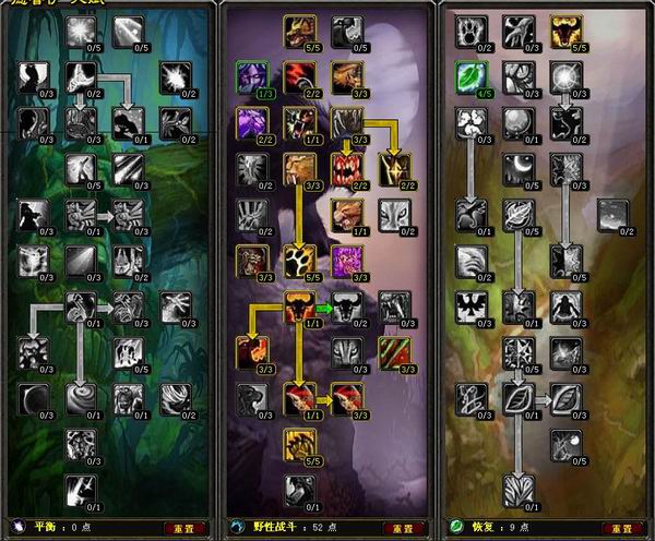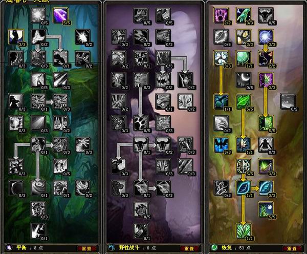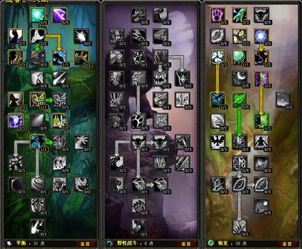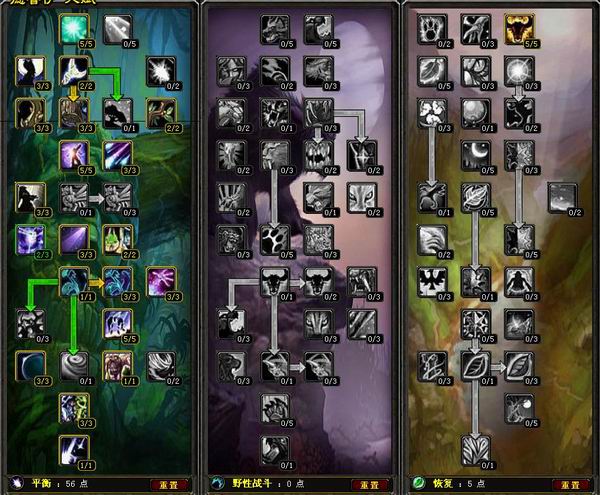 德鲁伊天赋模拟器德鲁伊讨论区PvE平衡56/0/5点击查看输出方法为愤怒+星火,恢复系出了激怒增加法伤.PvE野性0/52/9点击查看最大化仇恨,最大化防御,放弃凶暴!适合MT,抗单体boss,不需要横扫0/51/10点击查看适合群拉的熊T天赋,适合小FB,打AOE。PvE恢复8