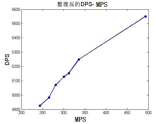 图上分为两条折线,在MPS为260-362段,每增加1 MPS能增加2.3DPS,在MPS为336.0-493.4段,每增加1 MPS能增加0.9DPS.