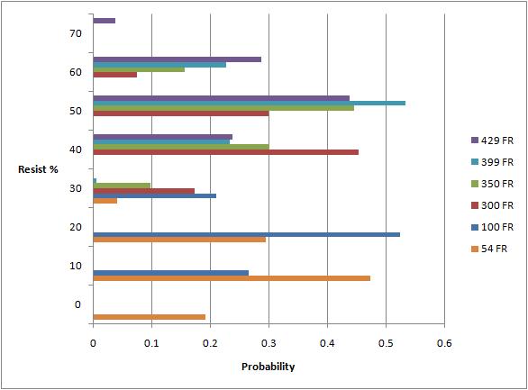 如果没有能力去估算实际分布,那么在实际情况下最有用的是去知道可以避免某些较低的抵抗百分比所需要的抗性值。正如Mijae在以前的帖子中指出的那样,当平均抵抗正好比避免的抵抗百分比多20%的时候,临界值很可能会出现。所以,80级400抗性的情况下,平均抵抗是50%,不会出现30%以下的抵抗,最小的抵抗是40%。