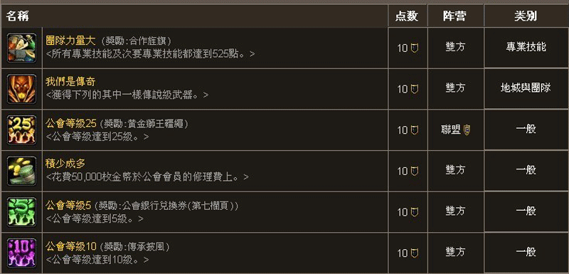 大灾变中也增加了公会成就,成就机制与公会升级机制相同,你需要达到公会成员的最小比率来完成成就。公会成就与玩家成就类似,你可以期待以下内容: