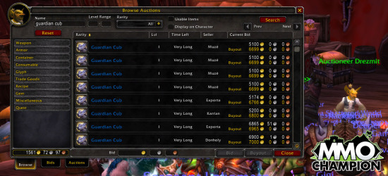 那么现在美服出售小翼狮守护者的状况如何呢?我们从一张拍卖行的截图上可以看出来,已经有部分玩家开始了小翼狮守护者的拍卖,售价还算正常。