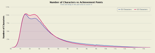 以成就点数来说,可以看得出来美服的休闲玩家(低成就点数)的人数比欧服来的多,而高分数的玩家则是欧服比美服更多,似乎可以说明为什麽世界首杀总是由欧服拿下。而虽然後面看似人并不多,但欧服成就点数超过10000分的依然有上万人以上。而在休闲玩家上分别有两个高峰,代表着就是有没有在新的85级副本拿下一些成就点数。也就是说明显有一部份人对于成就,甚至对于副本是有些厌倦的。