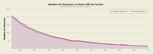MMO表示这个数字曲线上欧服与美服差不了多少,所以若依照阵营来看,整体来说部落确实比联盟玩家来的嗜血一点,但到了中高端其实没什麽差,两边都一样的爱杀人。