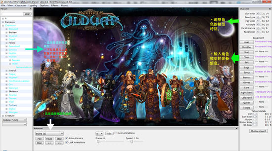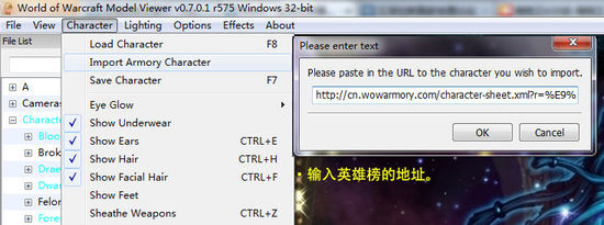 选择好你想要的种族和性别,在右上调整发型肤色脸型等特征,右侧栏输入装备信息。