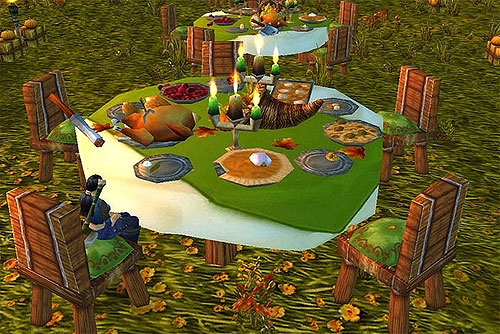 盛宴餐桌是感恩节庆典的重心所在,这是一张堆满了食物并由可互动的椅子所环绕的桌子,您能透过快捷列来享用并与其他玩家分享食物。