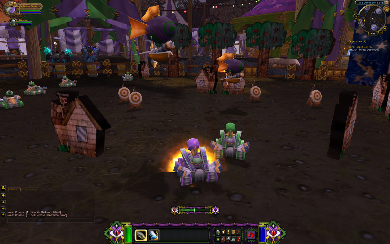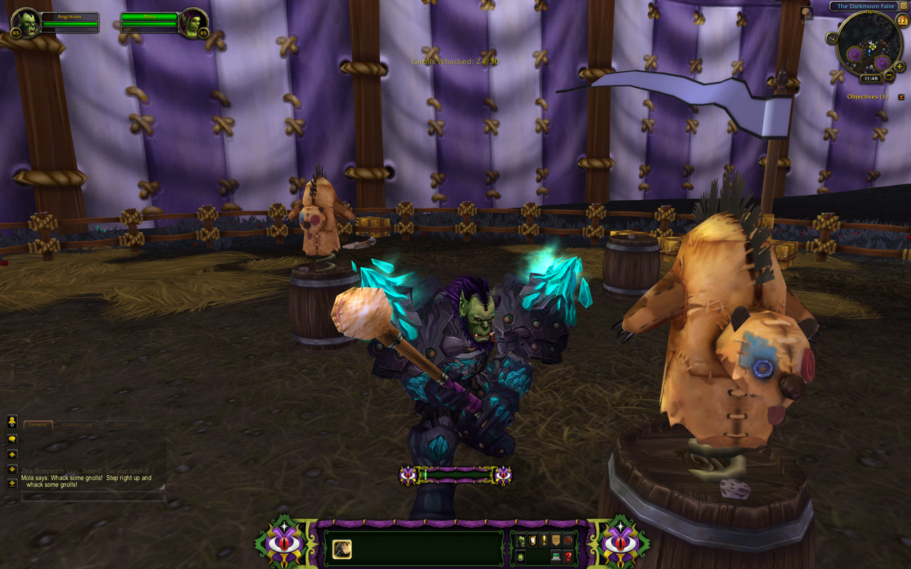 我们有游戏吗?当然有游戏,甚至简单到连兽人都会玩。你要做的就是来到我们的娱乐场,购买一些暗月游戏代币就能玩啦。上手简单,可要掌握窍门就有难度了,每个人都可以参与其中并且都有机会获胜。用你的游戏代币去试着赢取暗月马戏团奖券吧,现在你可以在这里玩到诸如打豺狼人,蒸汽坦克大挑战,暗月火炮,套圈圈,射击场