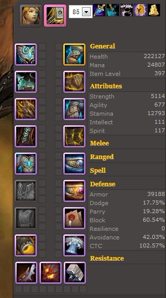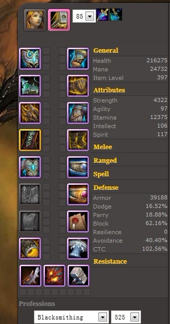 说明:此属性图为重铸后,加上精通药剂和抗性药剂后的属性,专业技能为制皮+锻造,宝石全部使用史诗品质宝石。蓝色一律75耐力,红色一律25招架37耐力。黄色一律25精通37招架耐力