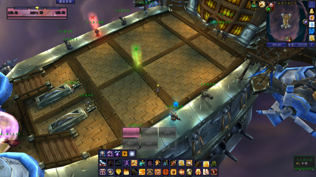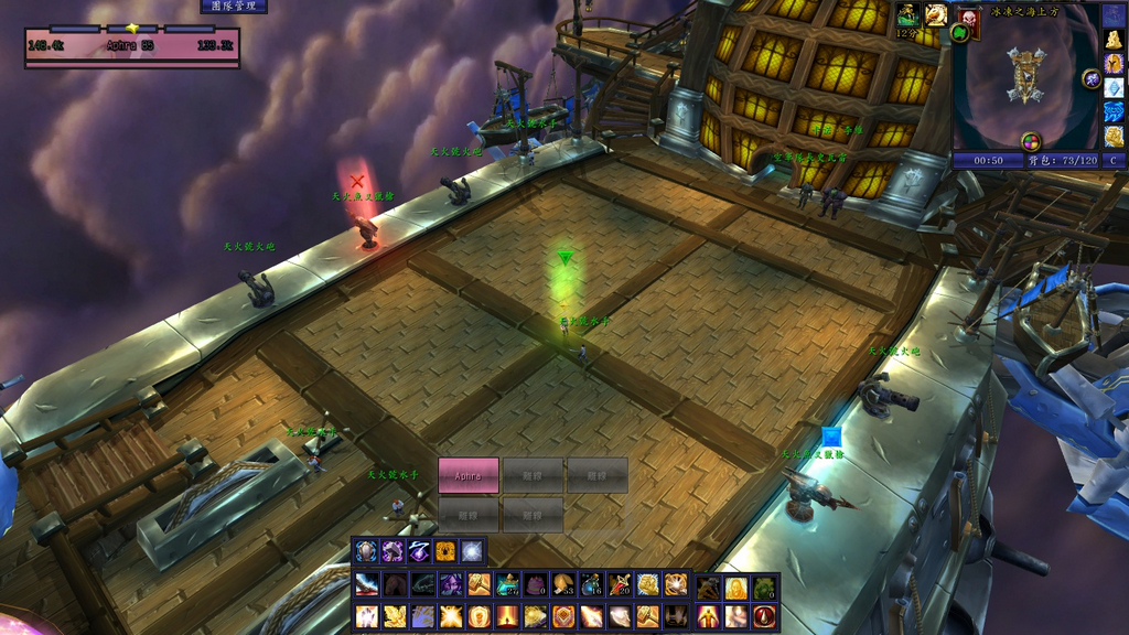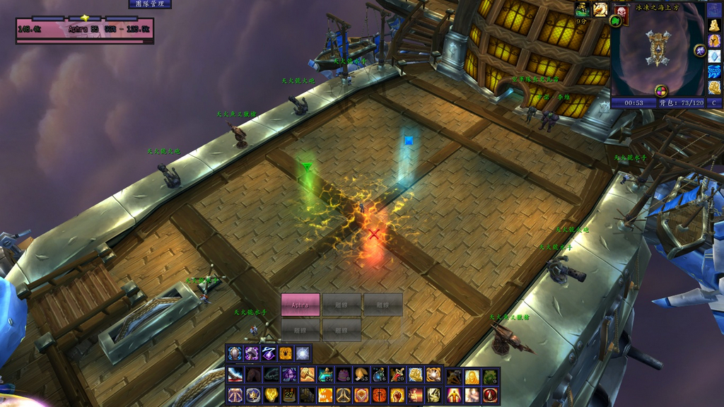 阶段1:黑角下地,古力欧娜在空中吐暮光暗炎圈。如图,该阶段坦克将黑角拉在甲板中部(绿色位置右侧),若有火,可视情况换位置,以离右侧船舷稍近为佳,远程DPS去右侧船舷(X位置那一侧)攻击古力欧娜。