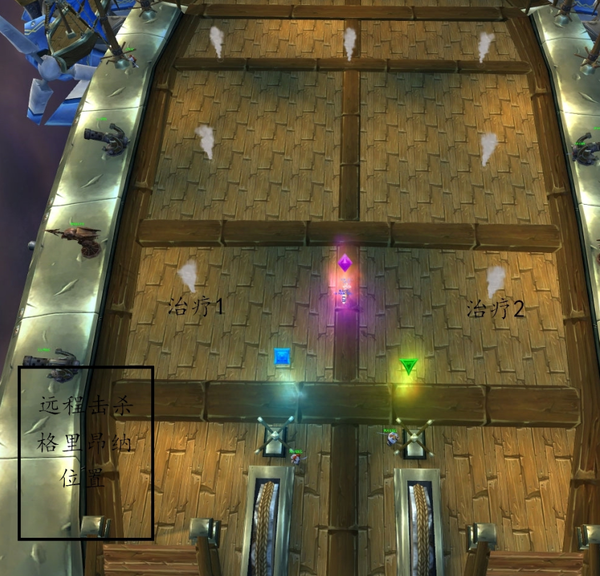 按照图上站位站开,开场俩个T分别接好俩只小怪,DPS集火逐个清掉。小龙下来远程第一时间转火清掉。之后的俩只小怪,俩个坦克都交换着拉,防止DEBUFF过高。工兵有DKT死亡之握,QS制裁(我们团队是俩个QS,所以打工兵轻松)。