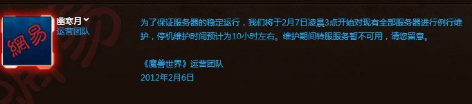 《魔兽世界》国服官方运营团队发布了最新的维护公告,本次维护将从2月7日凌晨3点开始,预计持续10小时。