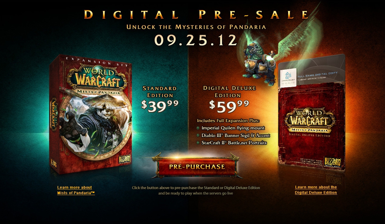 暴雪娱乐今天宣布,世界上最受欢迎的大型多人在线角色扮演类游戏《魔兽世界》的第四部资料片《熊猫人之谜》将于9月25日开始于线上及线下发售。该资料片一旦发布,联盟和部落的无畏的探险者们就可以登陆失落已久的潘达利亚大陆海岸,开始一段艰难的旅程,揭开这片大陆古老的神秘面纱。