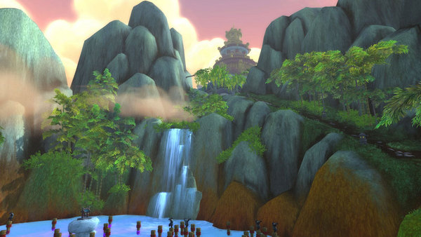 这些就是在梅花桩上训练的武僧们了,他们的师傅在瀑布的上方看着他们呢