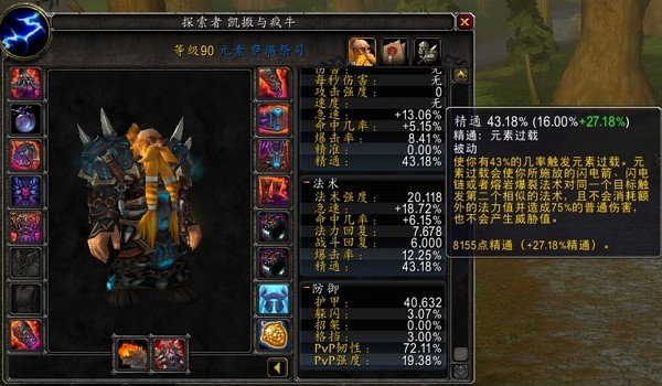 由于90级PVP需求的命中为6%所以还是重铸了一部分命中来达到标准。那么你可以看出急速很高,这个是因为目前元素SM自带全团5%急速和我点了自然瞬接又被动提升5%法术急速的缘故,实际这套装备就7.66%的加速加成。然后就是暴击,精通装的一般都是爆+精通或者急速+精通,所以你看到的没错,爆就是这么低。接下来是精通,比起现在85的毕业装备的40%过载率,这43%的过载率看起来碉堡了,但是别急,在木桩打了500发闪电箭后,得出这个数据其实是虚高,真实的过载率在30%左右,跟4.0时期,S9的属性差不多。那么总结下,再满足命中的情况下,最终的属性应该是12.5%的爆,19%的急速和30%的过载率。(所以,闪电链只有10%的过载率+12.5%的暴击率,这技能真是用来单体伤害的么?)