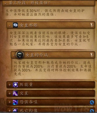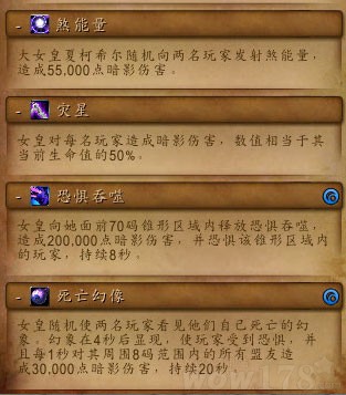恐惧尖啸:大女皇夏柯希尔随机对五名玩家施放恐惧尖啸,对每个玩家及其附近5码范围内的盟友造成10000点物理伤害。