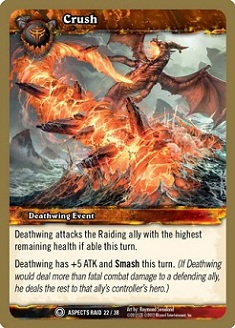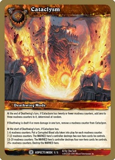 正如你们所见,大灾变牌是一张死亡之翼的模式牌。既然这不是一个标准的牌的类型,牌手们便无法与这张牌有任何的互动。每一回合,这张牌会随机得到零到三个指示物,你永远不会知道大灾变会以什么样的速度开始累积。你可能因为死亡之翼在全力对付阿莱克斯塔萨时处于平静而走好运,也有可能因为死亡之翼专注于消灭所有人而走上霉运。你摆脱这些指示物的唯一办法就是对死亡之翼造成伤害;如果一个牌手能够造成四点或更多伤害,你可以移走一个指示物,那么三个牌手就可以在死亡之翼的回合开始前最多移走三个指示物。与你的战友们紧密合作吧,否则死亡之翼就会迅速地淹没并毁灭他所有的对手!