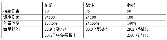 能量回复:刺杀保持割裂,敏锐保持切割,战斗保持切割下的回能情况。战斗比较复杂,包括专精额外20%回能速度,以及作战潜能带来的回复,作战潜能受急速和专精影响,盗贼现在有10%急速的被动buff。以上是在基础条件下的回能速度所以是≥155%。