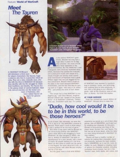《魔兽世界》!一个横行了十载的大型多人在线游戏。贸然回首,你可曾记得当年刚刚冒起的《魔兽世界》是怎么样的。以下是2001年(《魔兽世界》发行前三年),国外游戏杂志"CGW"(现已解散)对当时暴雪这款MMO新作的详细报道。