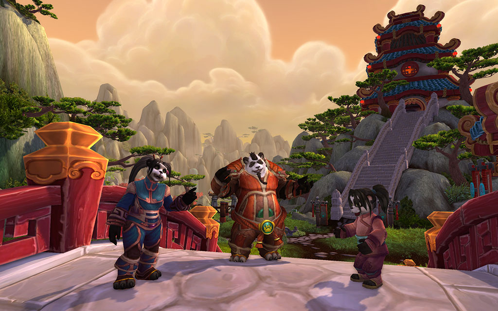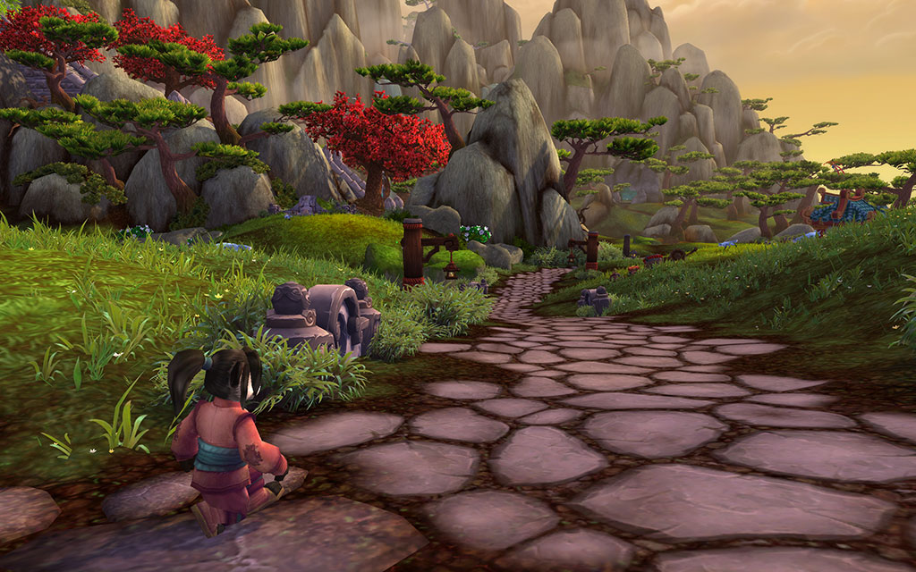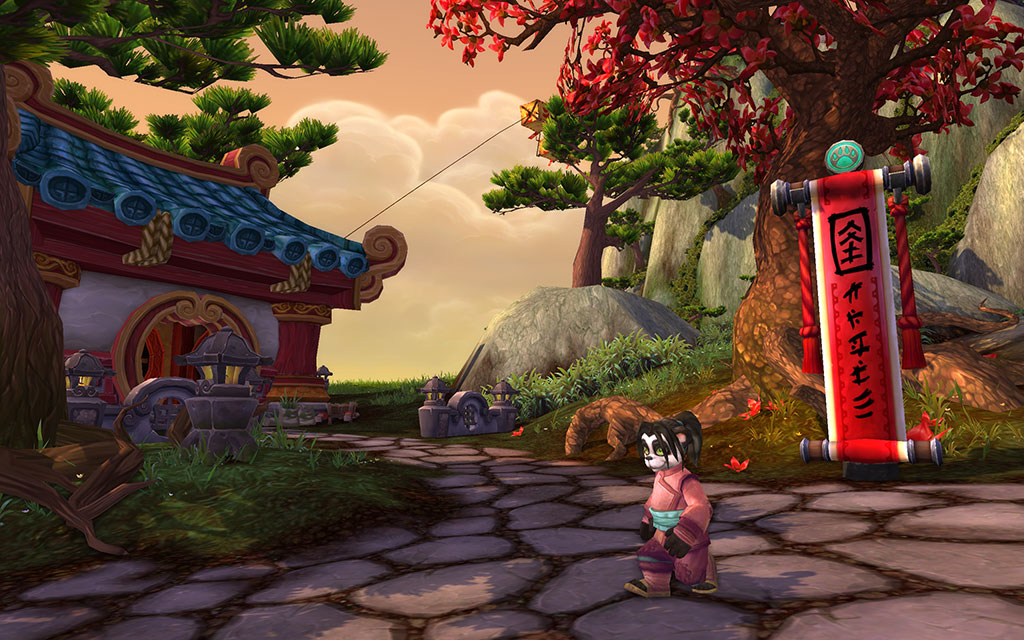 习武场坐落在村子东面一座高山山顶。赤手空拳的博斗声和武器与训练假人的对抗声整日在下方的山谷中回响。前往习武场的路上,我碰到两个这一带最有智慧的熊猫人:土水派大师艾莎?云歌和火金派大师季?火掌。
