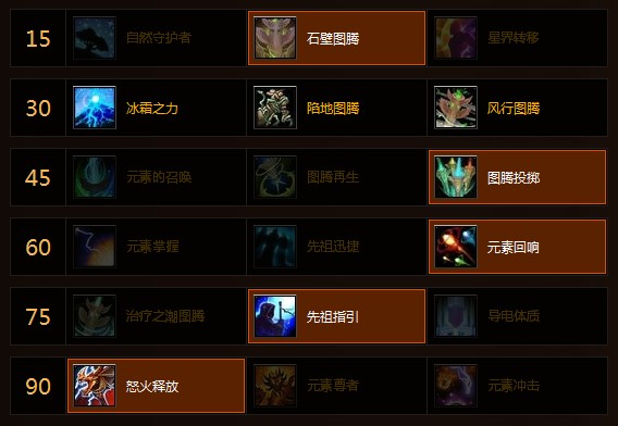 这才是真正意义上的输出天赋的一层,也很让人难以抉择。三个天赋技能都挺不错的,但总要选一个好坏出来。元素冲击是个不错的技能,但其读条机制和法术强度性质说明了这更多的是个法系输出用技能。而在实战中增强使用起来的表现也不如其他两个天赋。而元素尊者,虽说火元素在MOP中得到了强化,在这个天赋的支持下表现也是不错。