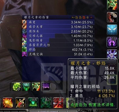 同样,现在的痛苦,我玩起来就是像玩4.3的毁灭那样来玩,而所谓的爆发,就是恶魔之魂+主动SP+灵魂碎片打出来的鬼影缠身,所以我说了,灵魂碎片并不是让你来常驻鬼影缠身的,而是让你留着来爆发用的,当然,这里爆发的同时也要尽量增加鬼影的覆盖率。