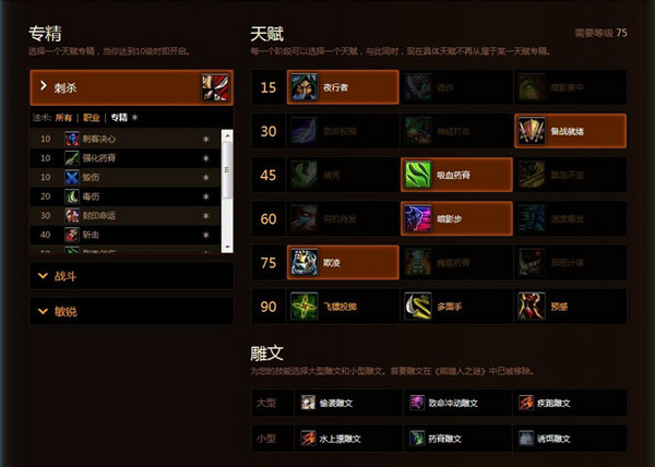 雕文里选择致命冲动,疾跑,偷袭雕文。(这里由于大家装备都是410左右,所以偷袭雕文取恢复雕文,由于天赋的效果,偷袭雕文有额外1秒的伤害提高。)小雕文:水上漂,毒膏,出血。