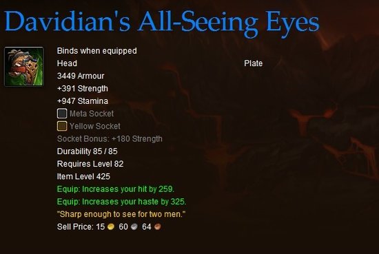 由于Ben Shaw在游戏中是一位名叫Hexu的兽人增强萨满,Owen在游戏中是一位名叫Davidian的死亡骑士。因此这两件装备分别被命名为“Hexu的增强之盔”(拥有朋友的人永不失明)和“Davidian的全视之眼”(视力好到相当于两人)