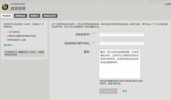 3.一个《魔兽世界》账号的招募战友上限为20个,发送一封招募信即被算作一个(不论是否接受招募)。