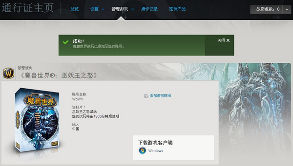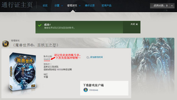进入战网通行证管理页面,输入通行证和密码后,系统将直接自动创建一个新的《魔兽世界》账号(请务必牢记此账号名,以免充值错误)。