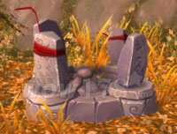 2、符文锁:任务需要找的魔古神器在废墟正北方(可以看地图上的任务标记),即下图位置。到达这里后,分别站到图中的几个蓝色圆形法阵上,使其激活,然后红圈处的魔古神器就可以取出来了。