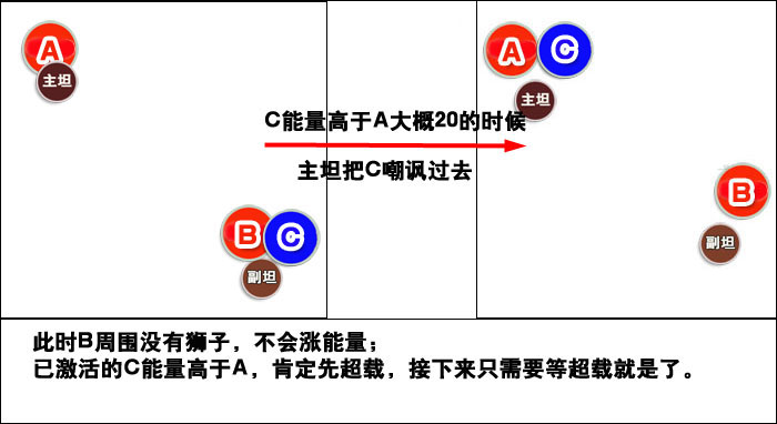 1、如下图,第一次超载结束后,如果是副坦手里的狮子C(A刚超载完)激活,那么啥都不用干,等着C超载: