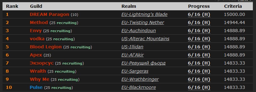 Method世界首杀25人英雄模式魔古山宝库关底BOSS - 皇帝的意志。因为DREAM Paragon先通了10人H模式,所以得分上领先,Method只能排名第二。