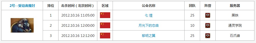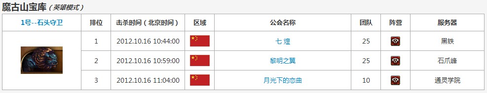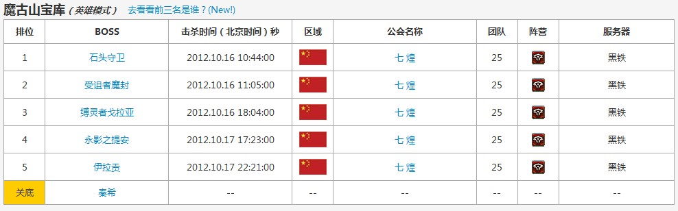 那么整个国服目前的H模式魔古山宝库的排名如何呢?下面就给大家介绍一下各BOSS的前三击杀情况(数据更新时间:2012年10月18日10时)。
