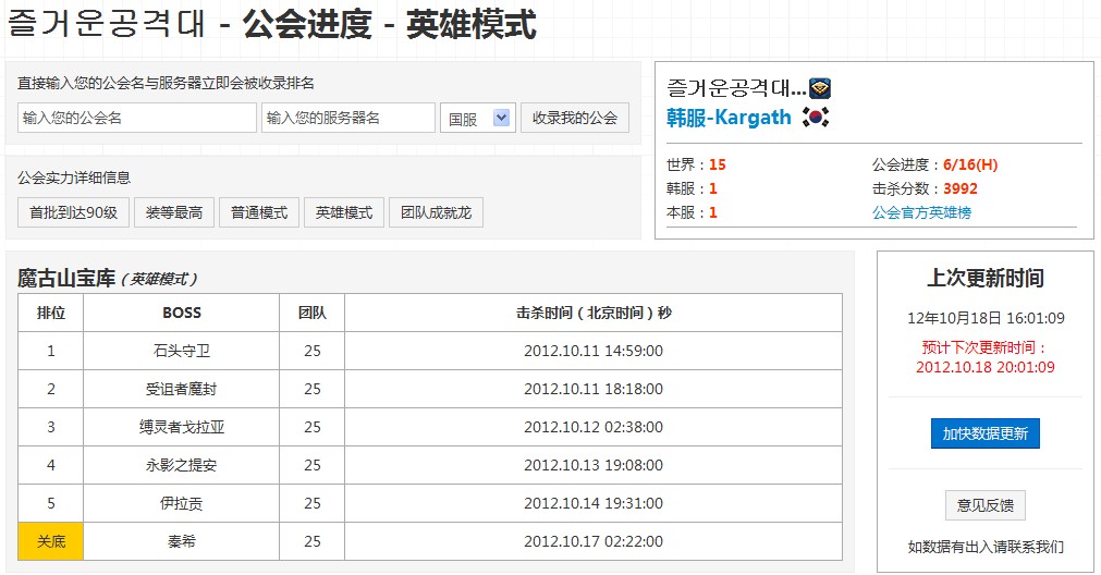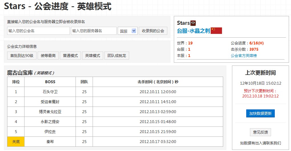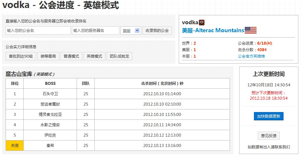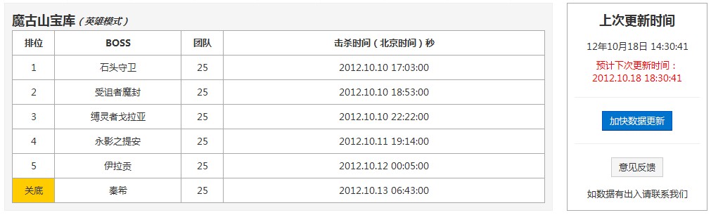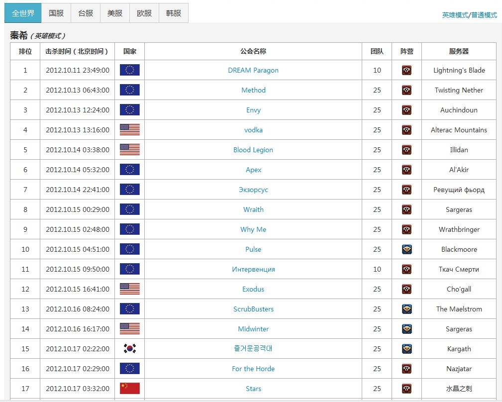 我们来看看本次世界范围内的H模式魔古山宝库的首杀争夺,世界首杀是欧服DREAM Paragon的10人团,他们于2012年10月11日23:49:00完成了世界范围的首杀,第二名也是欧服的著名公会Method,虽然是第二名,但是他们同时也是25人H模式的第一名。美服的首杀是由vodka公会在2012年10月13日13:16:00完成的,世界排名第四。而韩服的首杀则由“邻家男孩”公会完成,时间是2012年10月17日02:22:00,世界排名15。台服则是星辰完成了首杀,世界排名17。