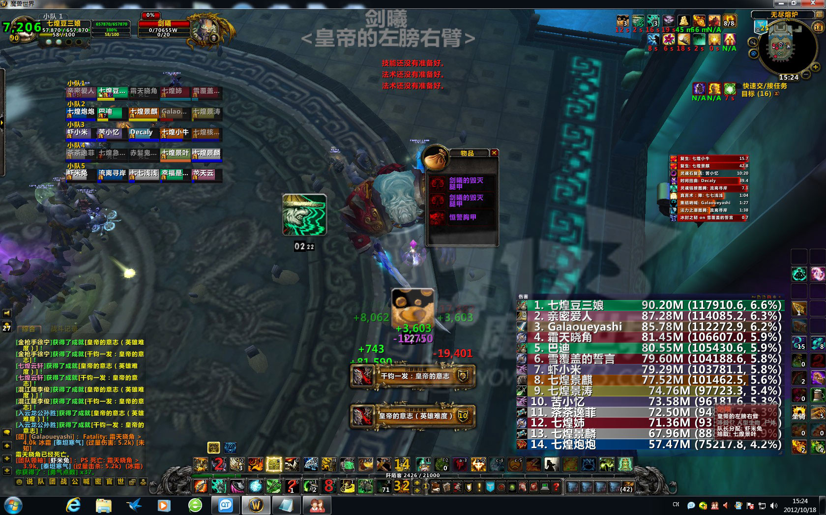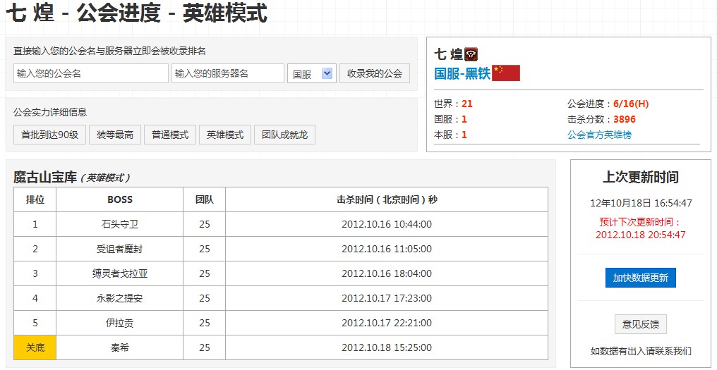 2012年10月18日15:23分,七煌工会国服首杀了25人魔古山宝库的关底BOSS - 皇帝的意志。完美地FD了25H魔古山宝库!在时间上是世界上最快的团队!让我们为他们鼓掌吧!这是属于整个国服玩家的荣耀!
