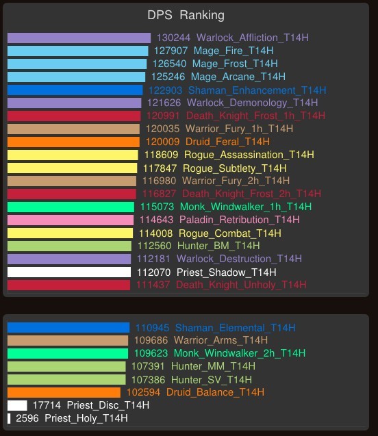 最近SimulationCraft模拟DPS排行榜更新的比较频繁,本次更新是其当地时间周日10月28日二***。 模拟的结果与上次差别不大,依然由痛苦术士领跑法爷一众,详情见图。